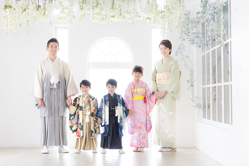 それぞれご自身で選ばれた着物をお召しになった主役のお子様達に合わせて、ご両親も和装姿で撮影にご参加頂きました。