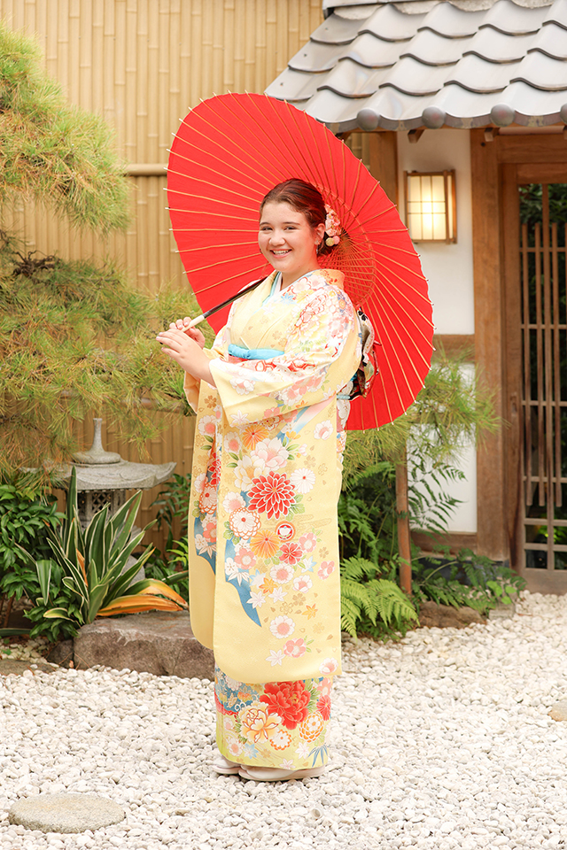 黄色の振袖と赤の和傘がお嬢様の上品さをより引き立たせています。