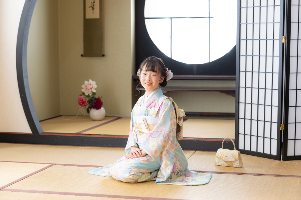 横浜店人気の和室スタジオで淡いブルーの振袖姿のお嬢様。
