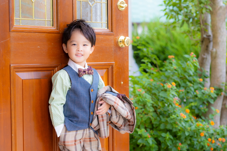 横浜店のエントランスで、スーツ姿の5歳様をお撮りした素敵なポートレートです。