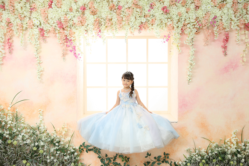 壁のグラデーションがポイントのお花に囲まれたとっても可愛い空間にお座りになられた主役様。