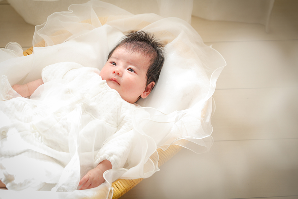 ナチュラルスタジオで、ベビーベッドの上でリラックスされるお嬢様のとても可愛らしいお写真です。