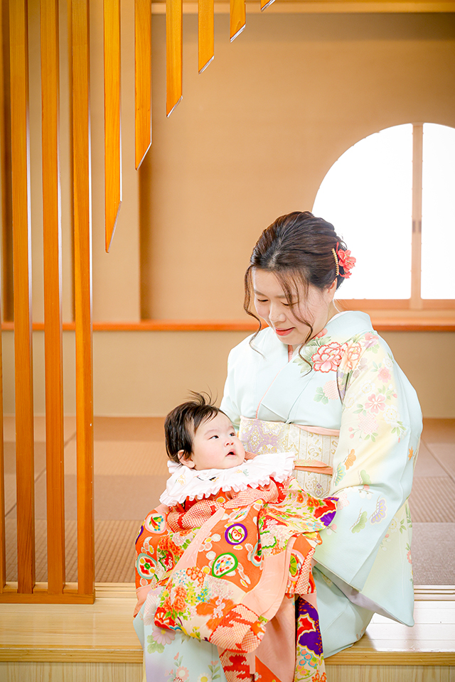 和室スタジオで、お母様に抱っこされるお嬢様の素敵なお写真です。