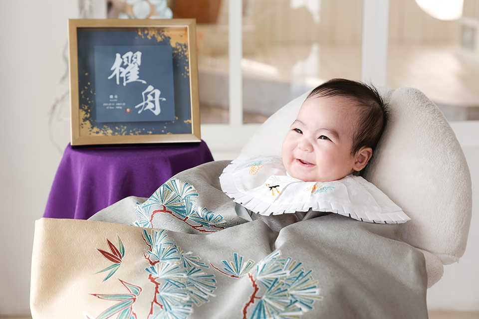 銀鼠色の祝い着をお召しになり、朗らかに微笑む赤ちゃんをお撮りしたステキな一枚。