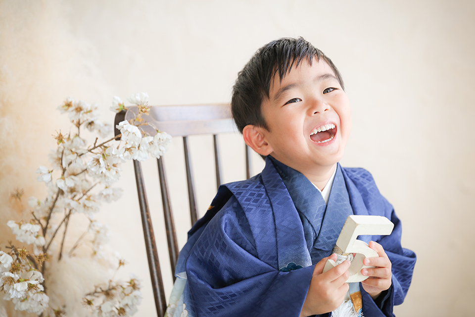 椅子に座り、5才の”5”を持つ男の子様。笑い声が聞こえてくるような弾ける笑顔から、思いっきり撮影を楽しんでいるのが伝わるステキな一枚です。