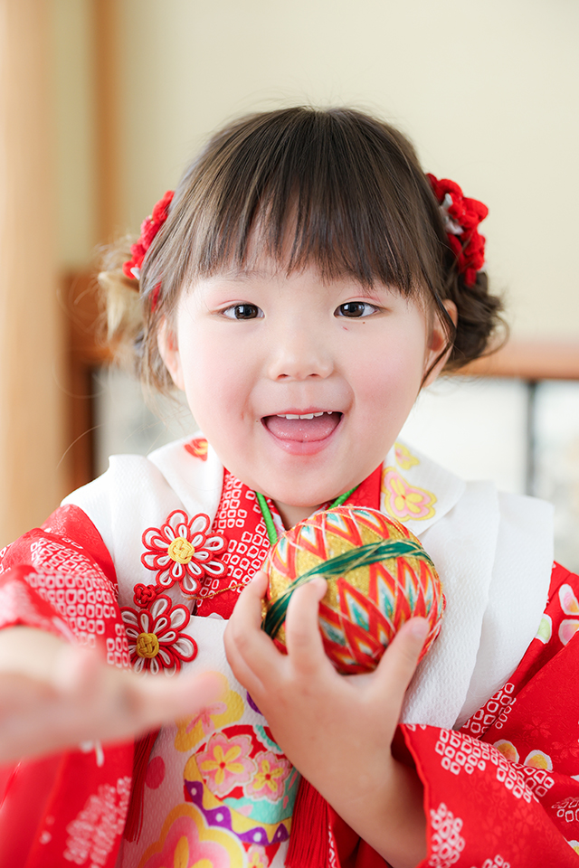 市川店人気の和室スタジオで、鞠を持ったお嬢様をお撮りした素敵なポートレートです。