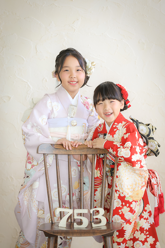 それぞれご自身で選ばれた振袖をお召しになったお二人。着物に合わせた髪飾りでヘアセットし、七五三ならではの和コーデを楽しんでいらっしゃいました。