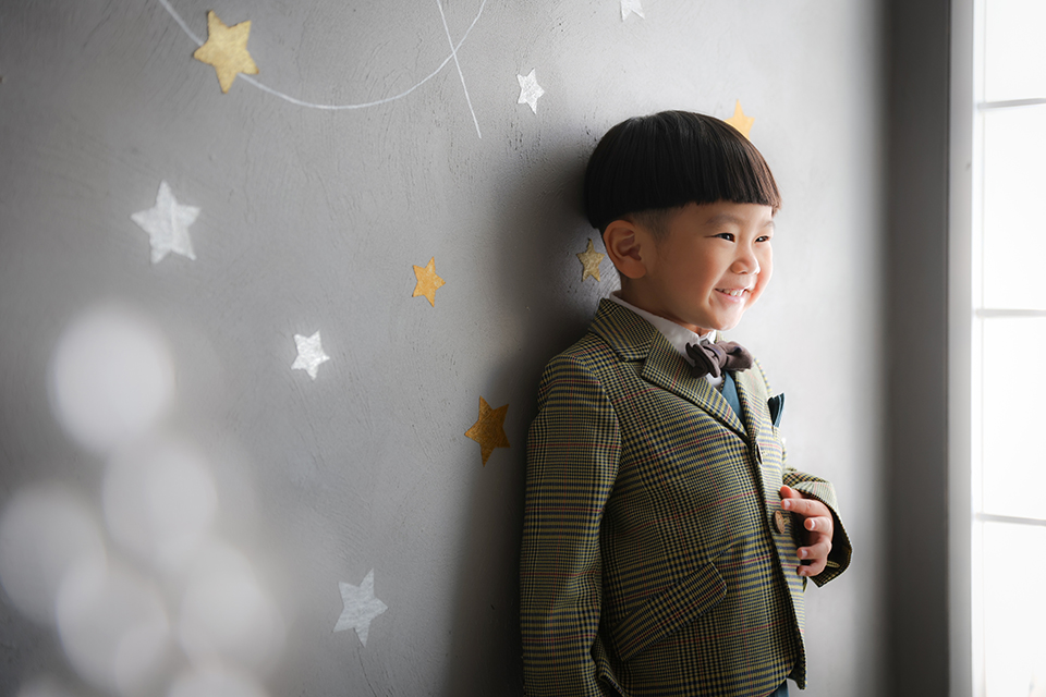 星が煌めく空間の中、スーツ姿の3才様をお撮りした素敵なポートレートです。