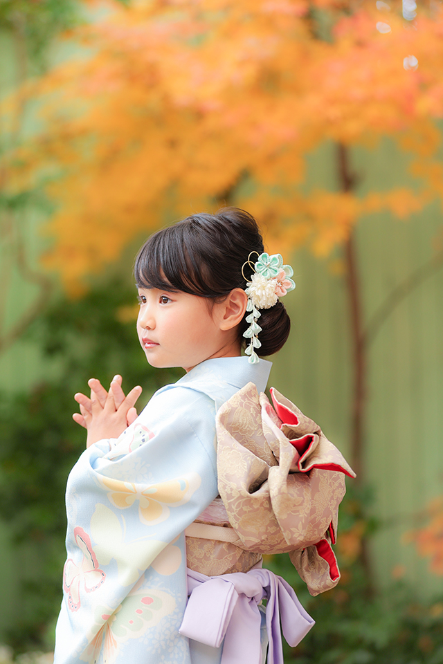 水色を基調とした蝶々の柄がかわいいお着物をお召しになり、お庭の紅葉の前でお撮りしたお嬢様のポートレートです。