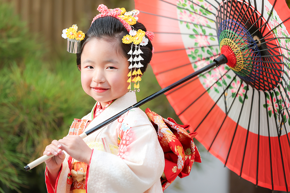 市川店人気の和風庭園風スタジオで、傘を差すお嬢様のすてきな1枚です。