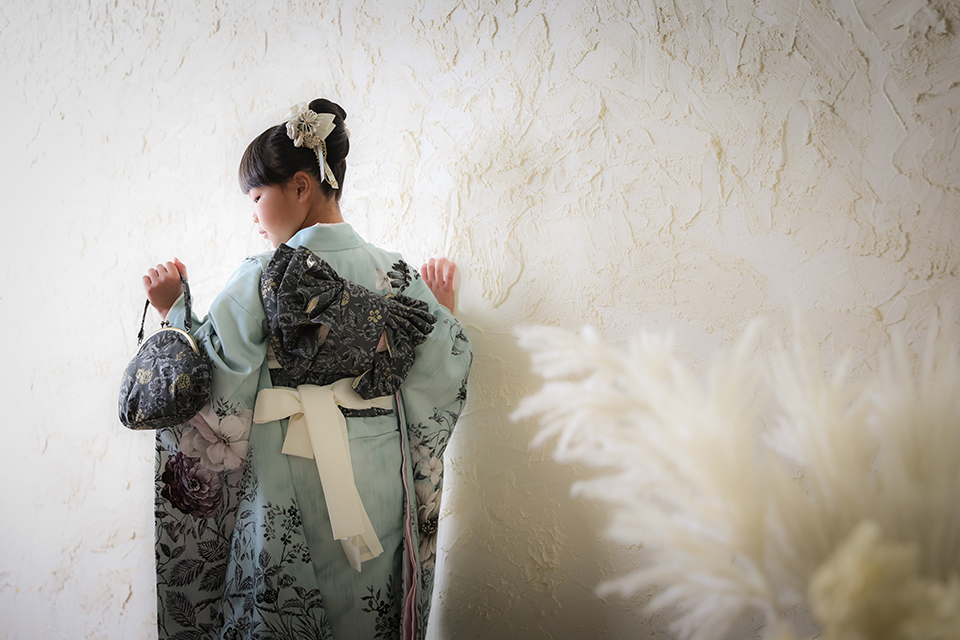 市川店の漆喰壁の前で、帯とバックの柄がセットなっていて後ろ姿もすてきな1枚となりました。
