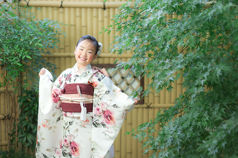 青紅葉が美しい本格的な和風庭園スタジオでは、優雅に袖を広げられ、ご自分で選ばれた着物をキレイに見せて下さいました。