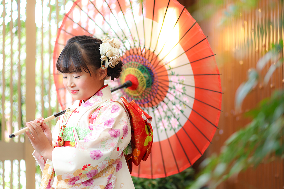美しい本格的な和風庭園スタジオでは、お着物にぴったりの朱色の和傘をさした姿や、もみじの葉で遊ぶ姿など、和の雰囲気たっぷりのお写真を撮影させて頂きました。