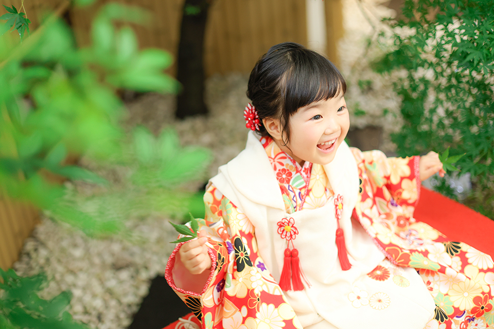 本格的な和風庭園スタジオでは、紅葉の葉っぱで遊ぶお嬢様の笑顔がステキな一枚を撮影させて頂きました。