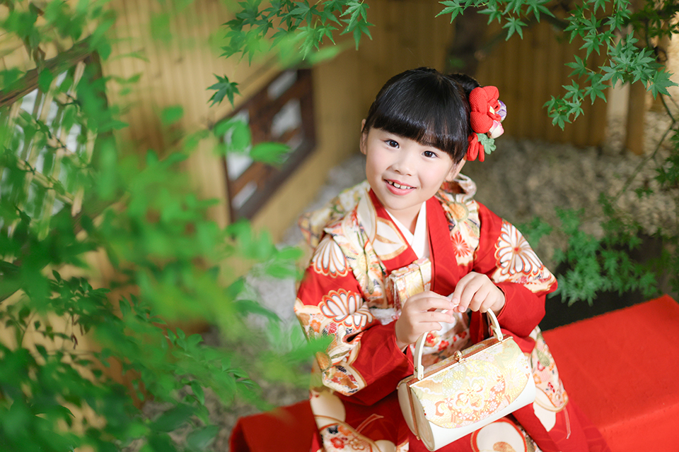 振袖とセットの鞄も品が良く、お嬢様の七五三のお祝いを美しく彩っておりました。