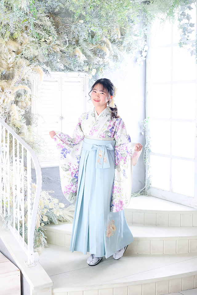 松戸市のおしゃれな写真スタジオ「アンズガーデン松戸店」に「当日の着付けができるため」と、小学校卒業式に袴をレンタルされるお嬢様が前撮りにお越し下さいました。