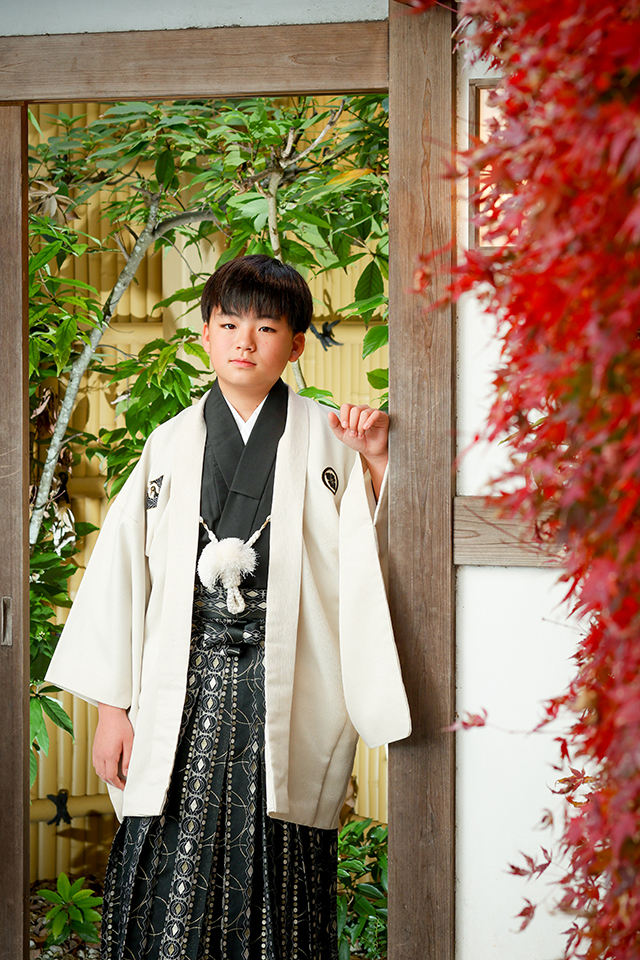 紅葉の咲く日本庭園スタジオで、クールに決めた主役様の素敵なお写真です。