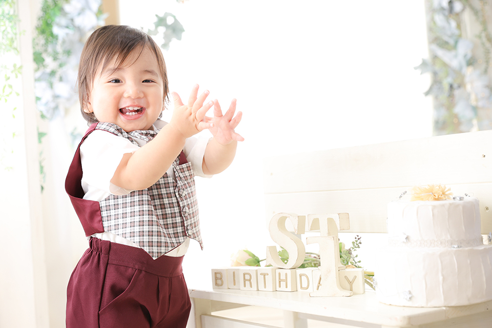 千葉市美浜区のおしゃれなフォトスタジオ「アンズガーデン幕張本店」に1才バースデーのお祝いでお越し頂いた男の子様です。