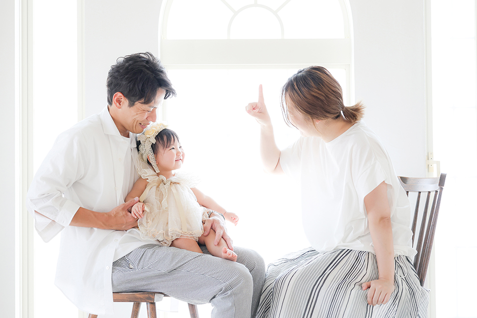 お誕生日を迎えたお嬢様に”1才のイチ”の指を教えるお母様。